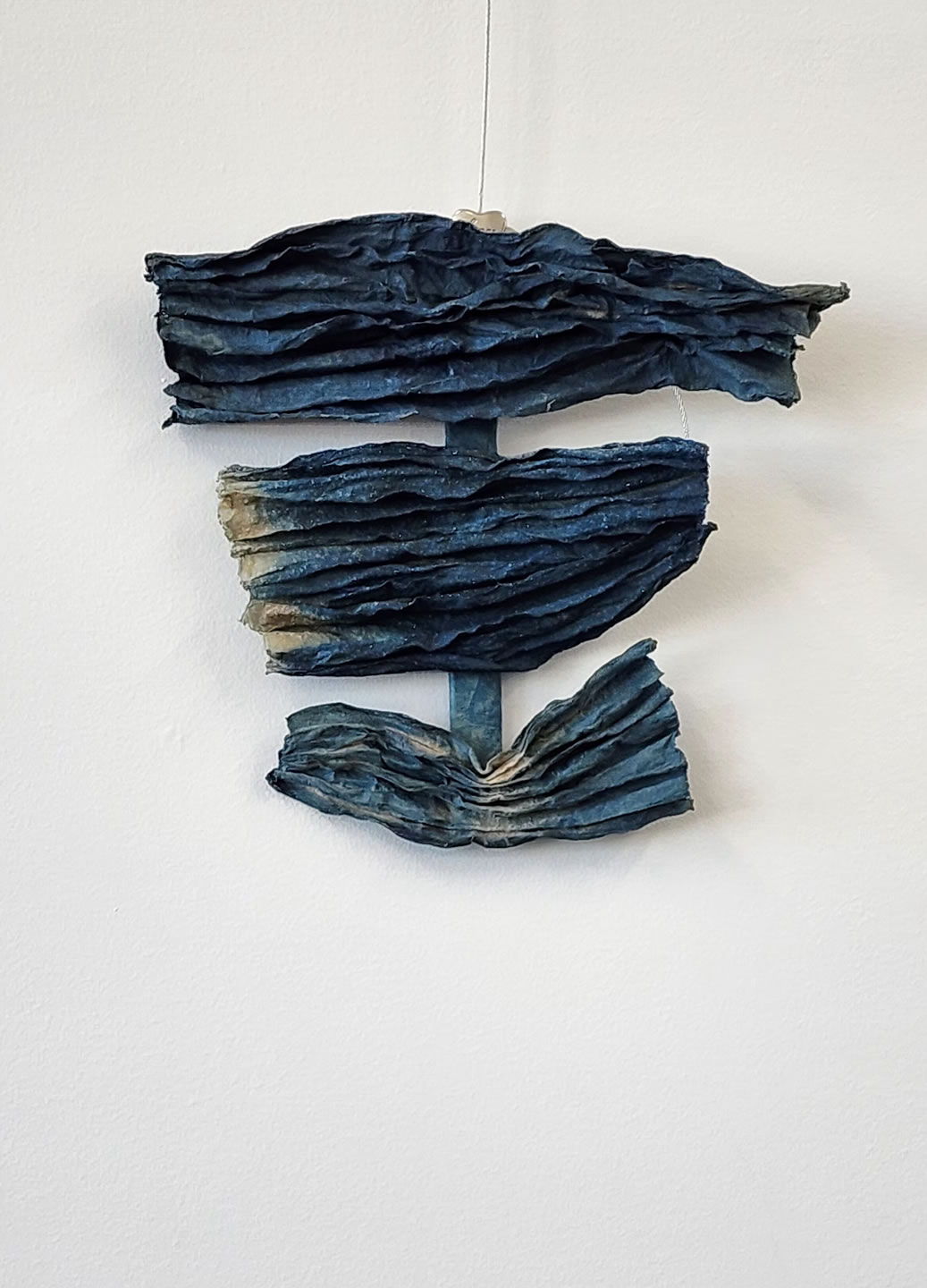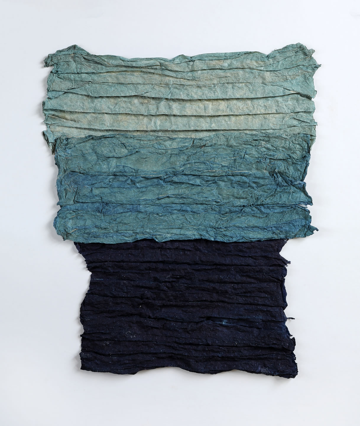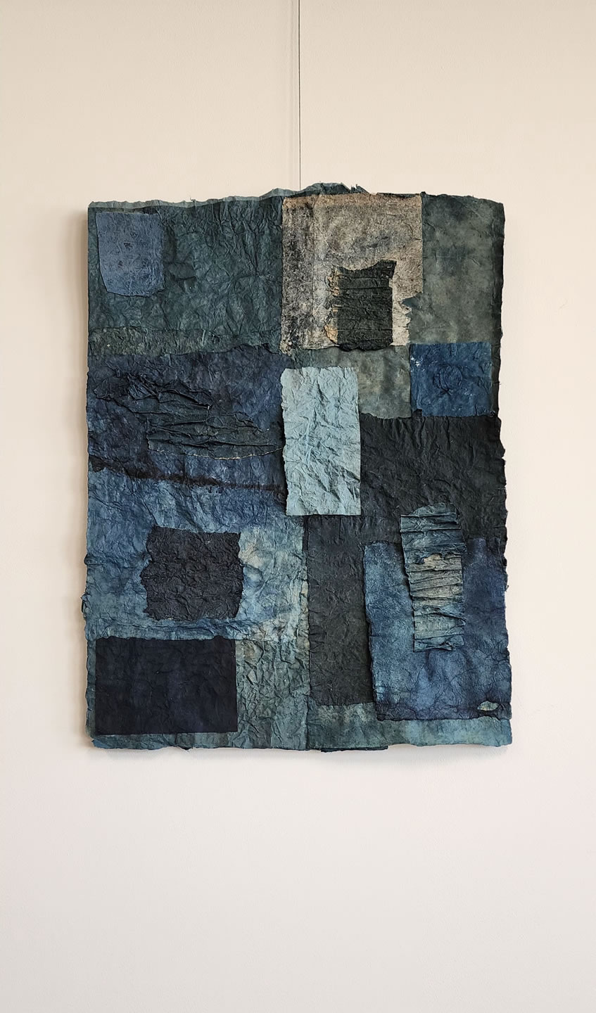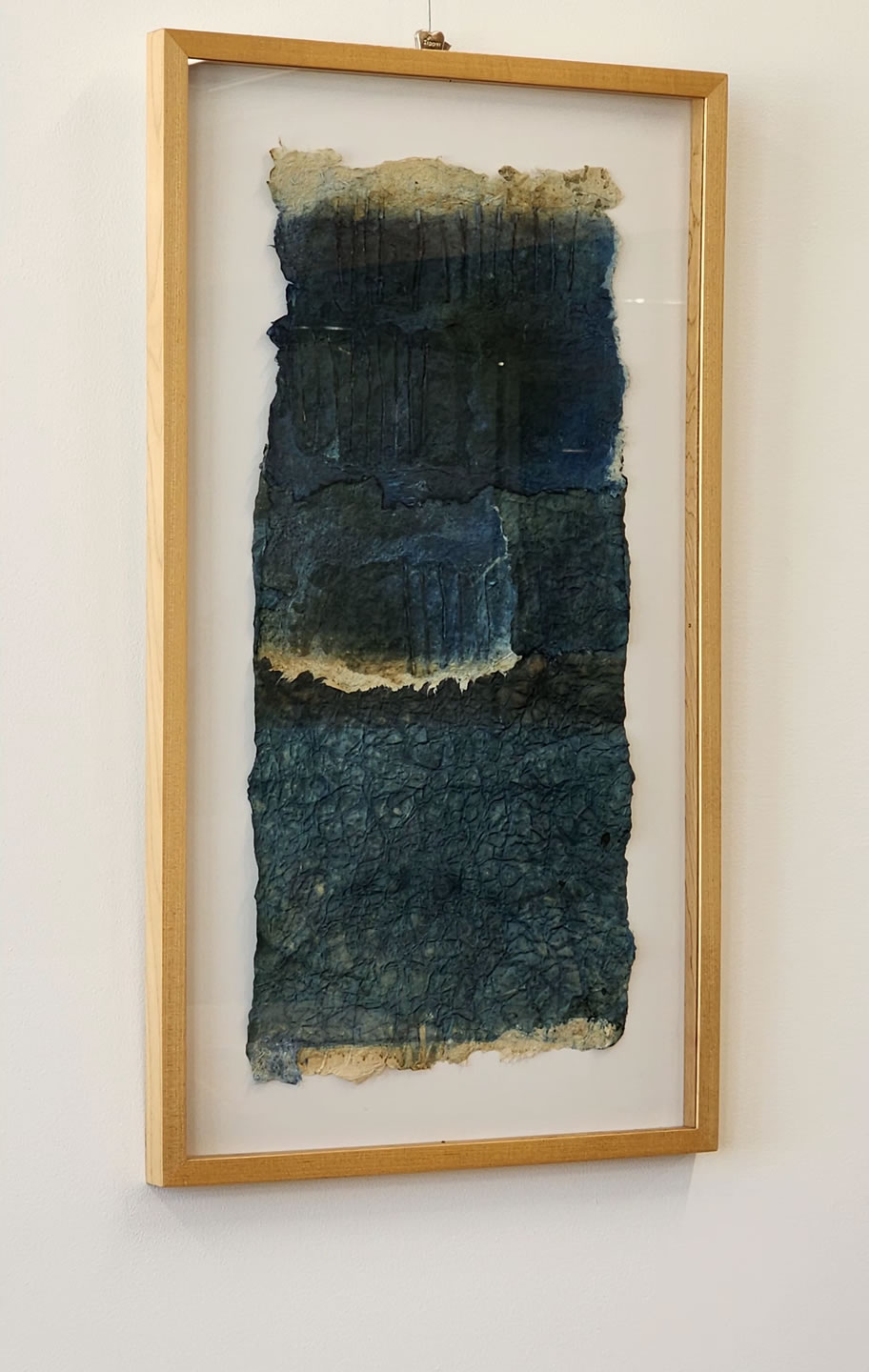 I have a long history of working in hand papermaking. For the past twelve years, I have ventured down the unexpected path of growing, researching, and learning to process indigo to dye paper and cloth. I am captivated by the colors produced which vary from teals to aquas to blues of clear days and dark night skies. I especially love that these blues speak to me of water. Some pieces on exhibit include indigo studies. The others allude to my sensory encounters with a lake in Vilas County, where I've resided for over four decades, and to visual recollections of my childhood spent mere blocks away from Lake Michigan.