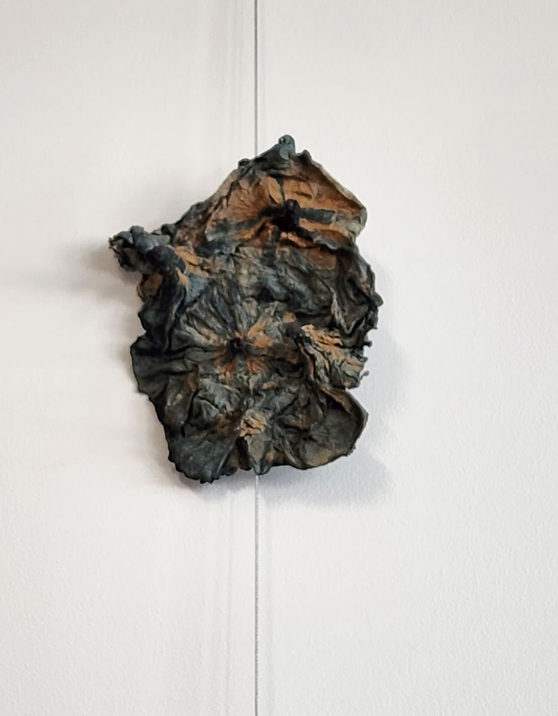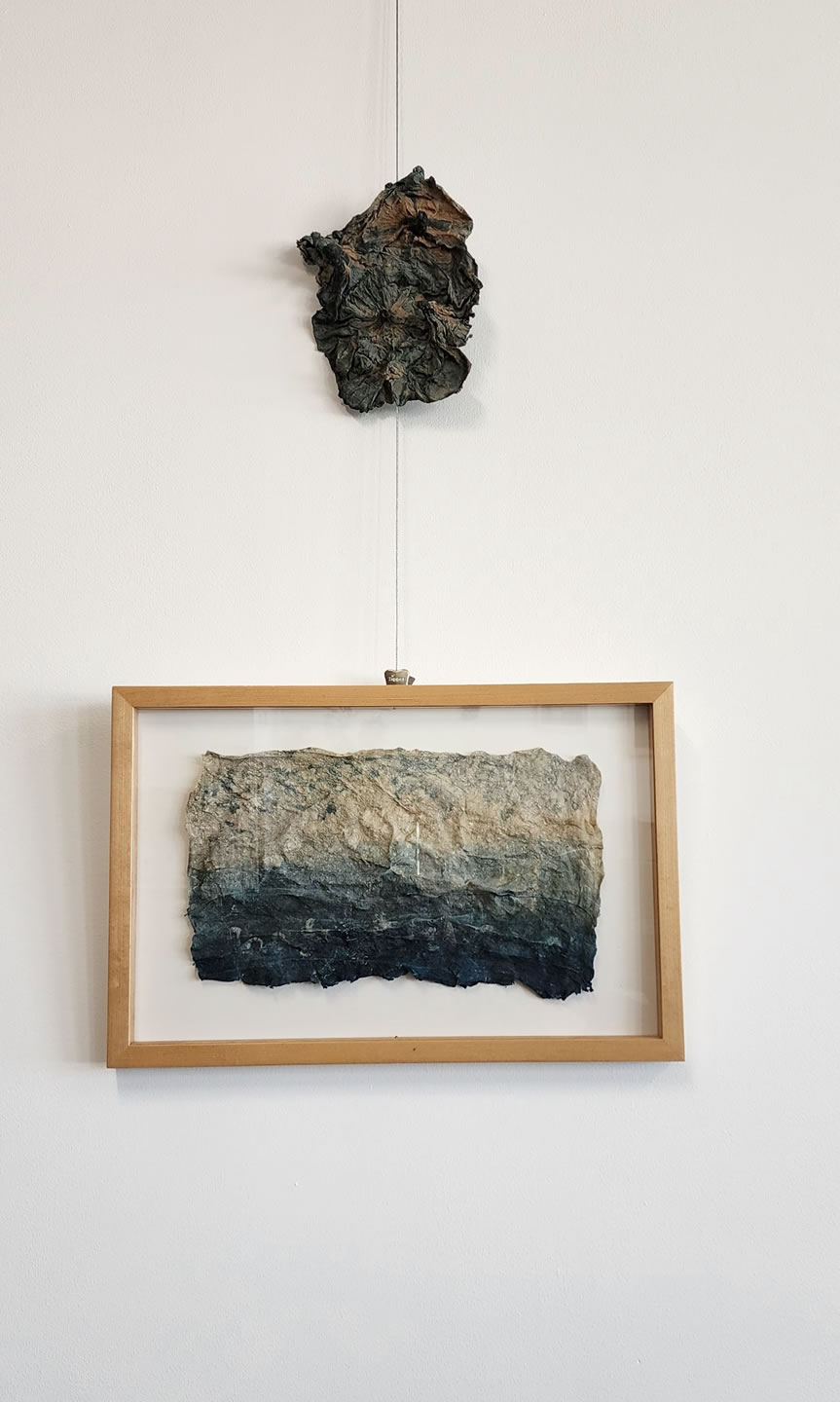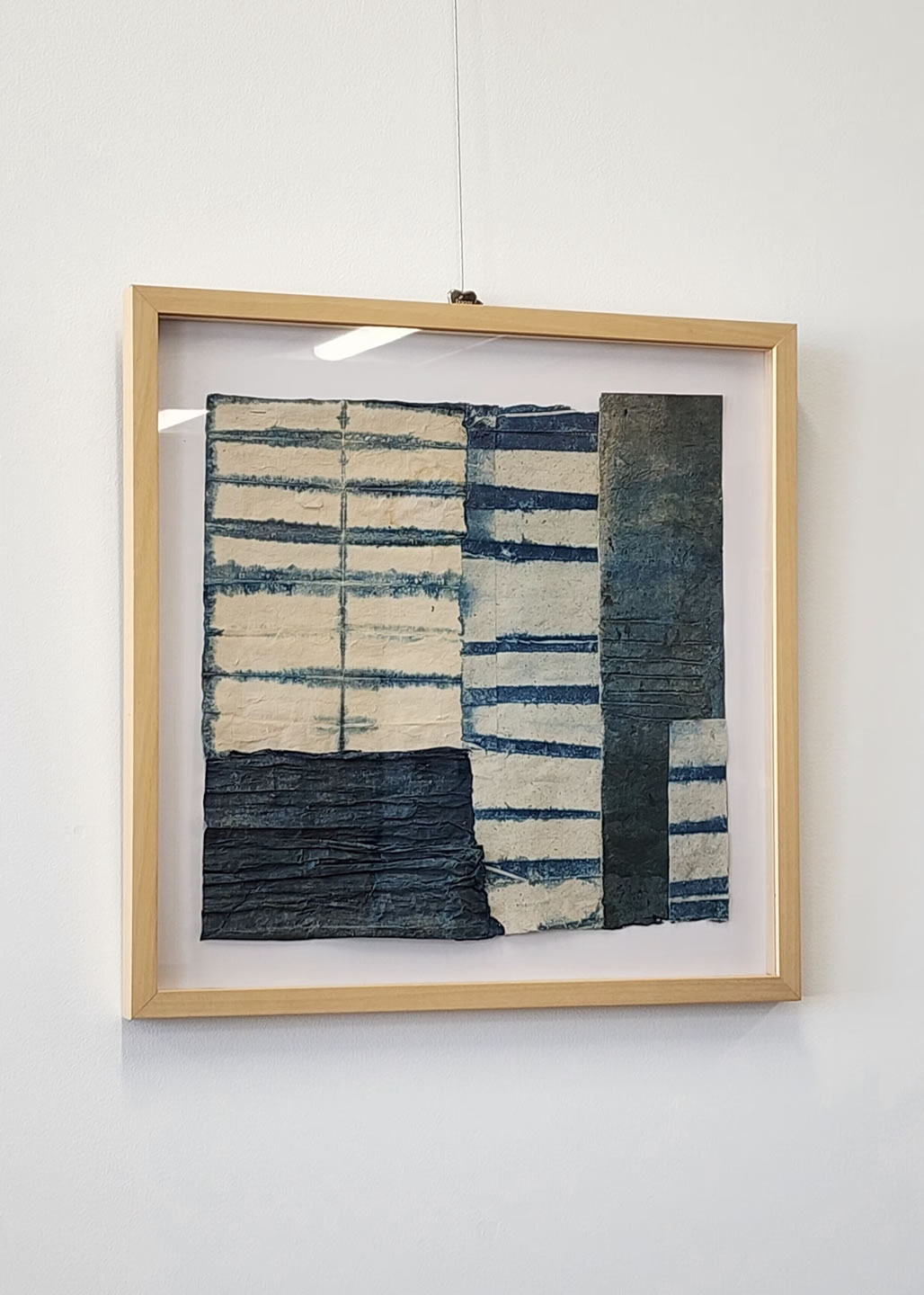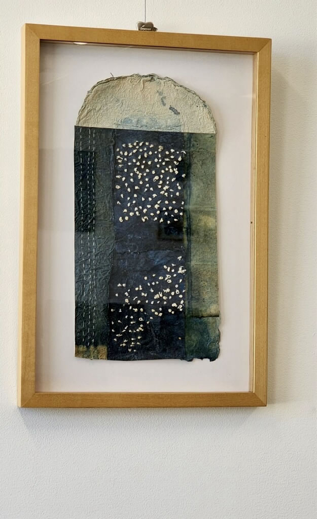 I have a long history of working in hand papermaking. For the past twelve years, I have ventured down the unexpected path of growing, researching, and learning to process indigo to dye paper and cloth. I am captivated by the colors produced which vary from teals to aquas to blues of clear days and dark night skies. I especially love that these blues speak to me of water. Some pieces on exhibit include indigo studies. The others allude to my sensory encounters with a lake in Vilas County, where I've resided for over four decades, and to visual recollections of my childhood spent mere blocks away from Lake Michigan.